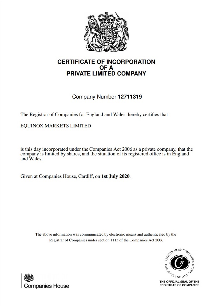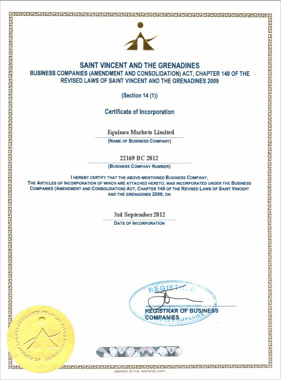 Equinox Markets Limited activity is in accordance with the authorities of Saint Vincent and the Grenadines under the International Business Companies (Amendment and Consolidation) Act, chapter 149 of the revised laws of Saint Vincent and the Grenadines, 2009, section 5(1).